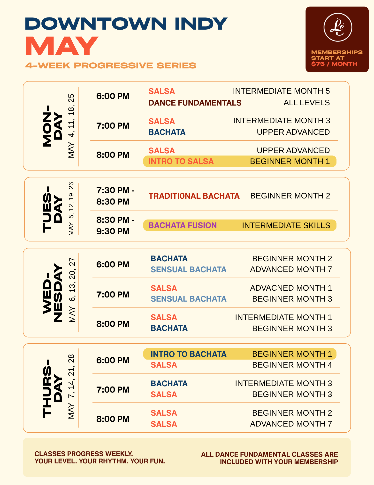 Drop-ins are welcome, though advanced registration for a course of four classes is encouraged. Classes within each 4-Week Cycle are cumulative, meaning it’s encouraged to make attendance a priority in order to have the best learning experience.